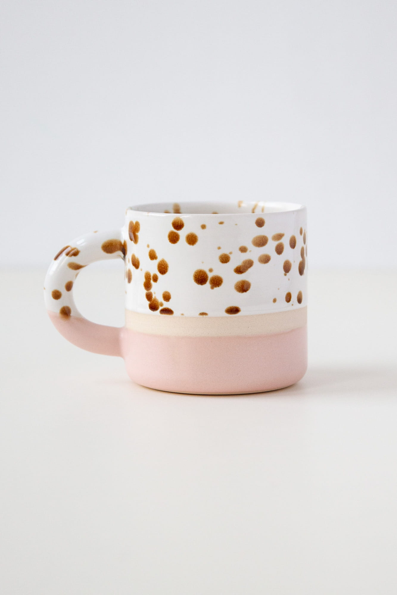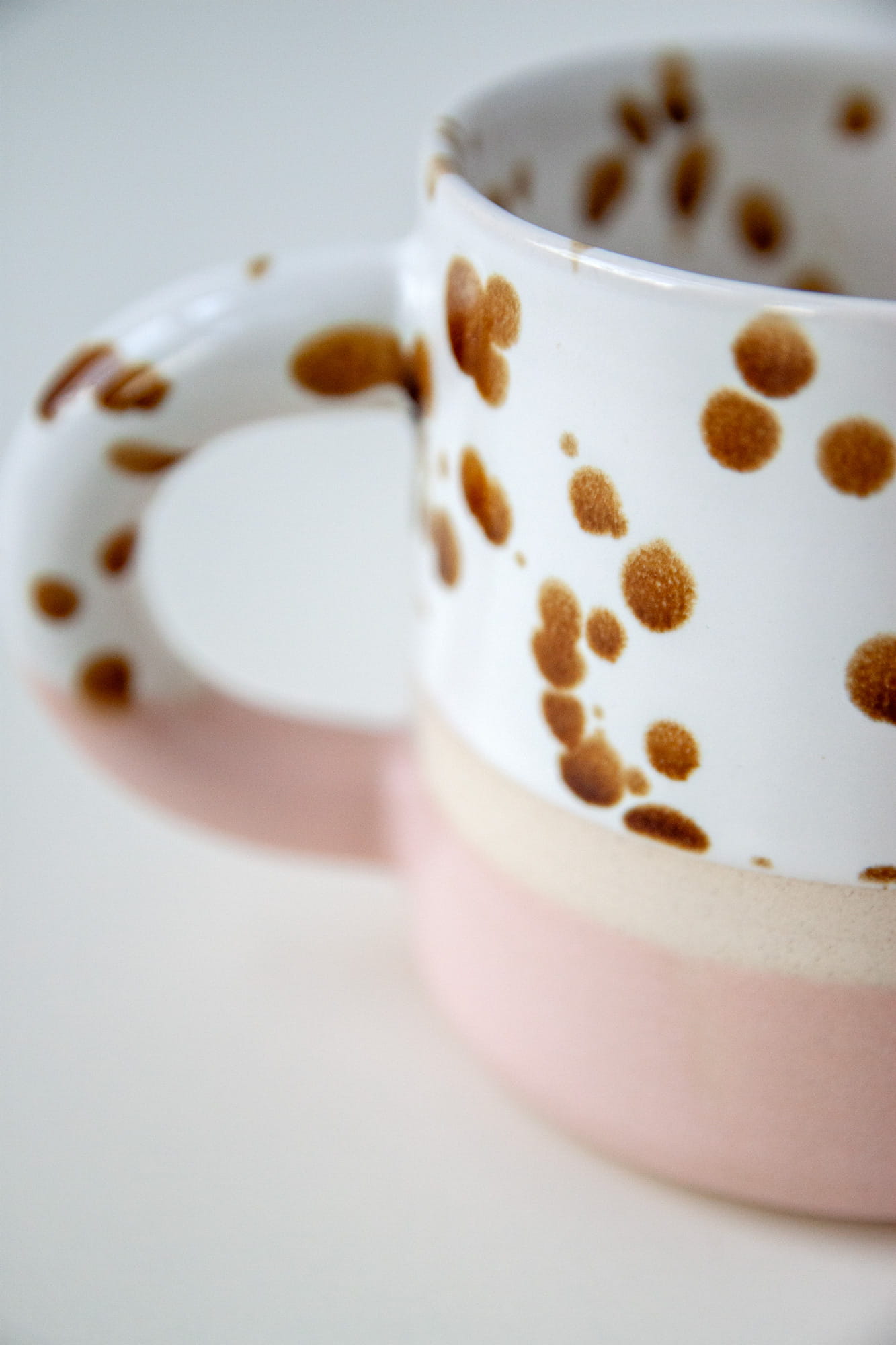 Seria kubków BOLD została stworzona na kole garncarskim z dwóch rodzajów kamionki do wyboru: jasno-kremowej lub ciemniejszej karmelowej. Wzory mają opływowe kształty i grube ucho. Dwie kontrastujące powierzchnie zdobienia oddziela pasek wysokiej jakości gliny.