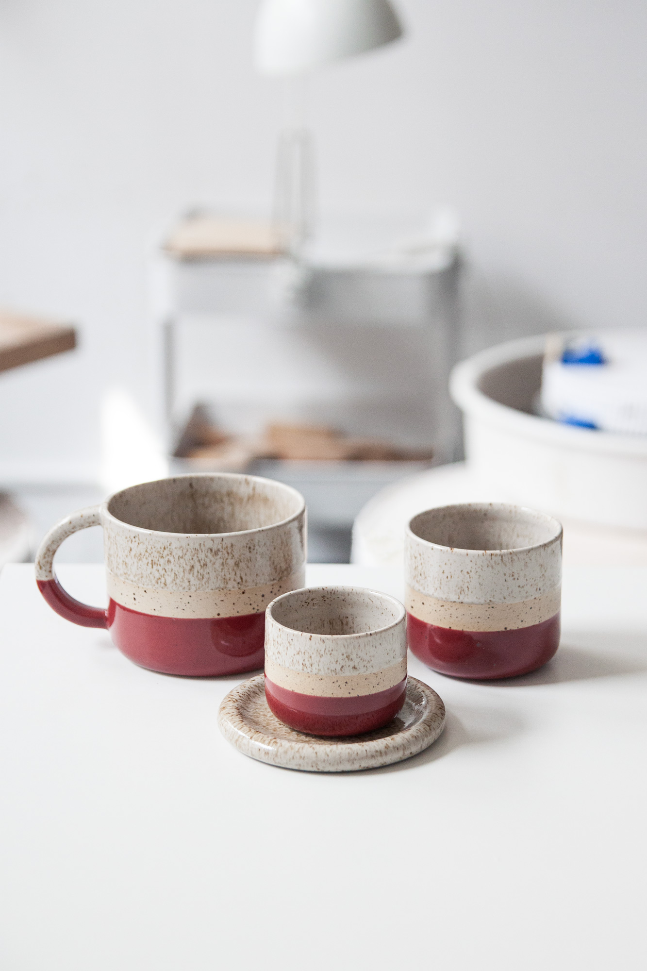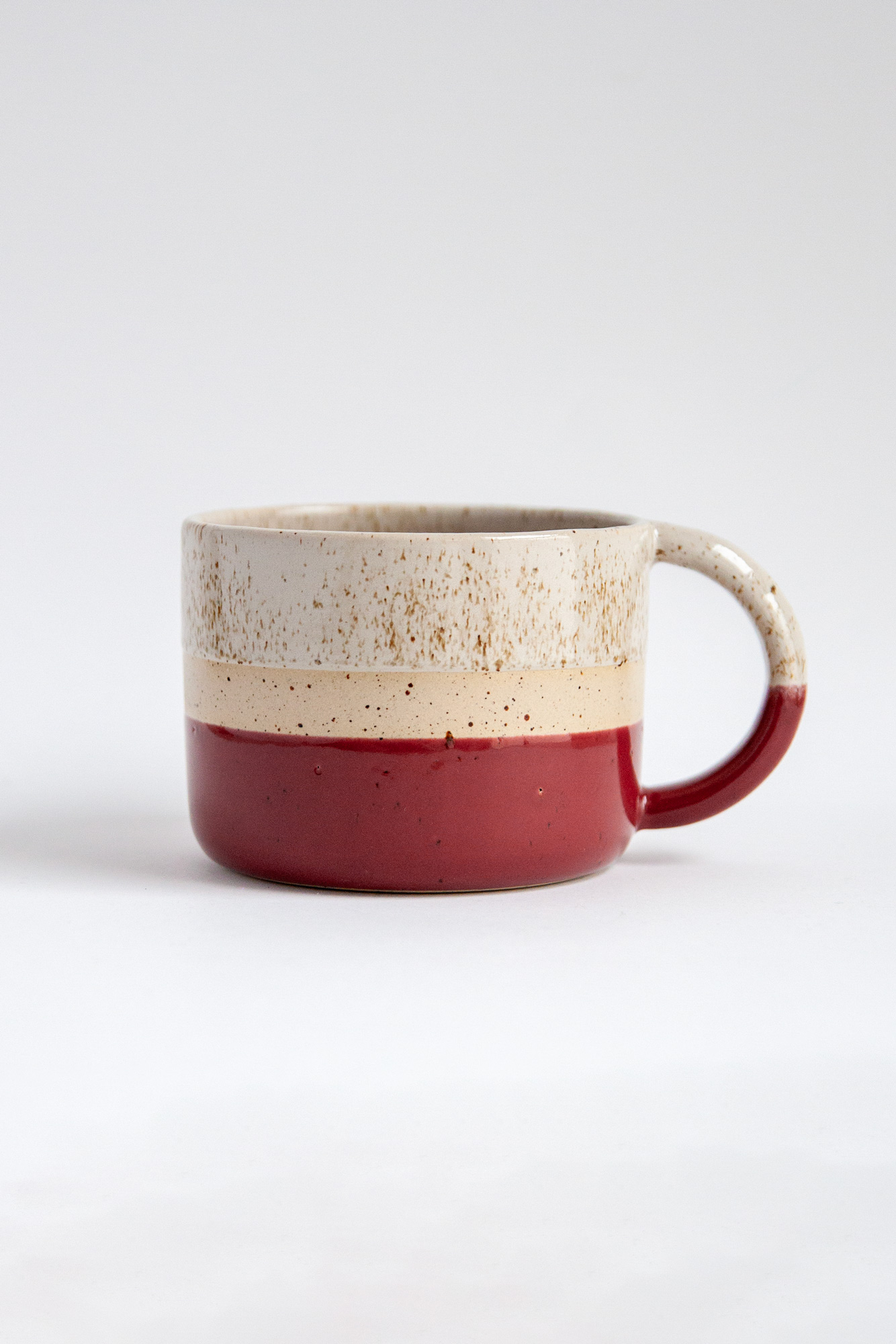 Kubek z piegowatej kamionki, toczony na kole garncarskim, pokryty błyszczącymi szkliwami: burgundowym oraz szarobeżowym w brązowe kropki.